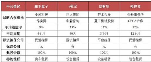 当前P2P行业内,有爱投资、积木盒子、e租宝、拾财贷四家开展有融资租赁项目。